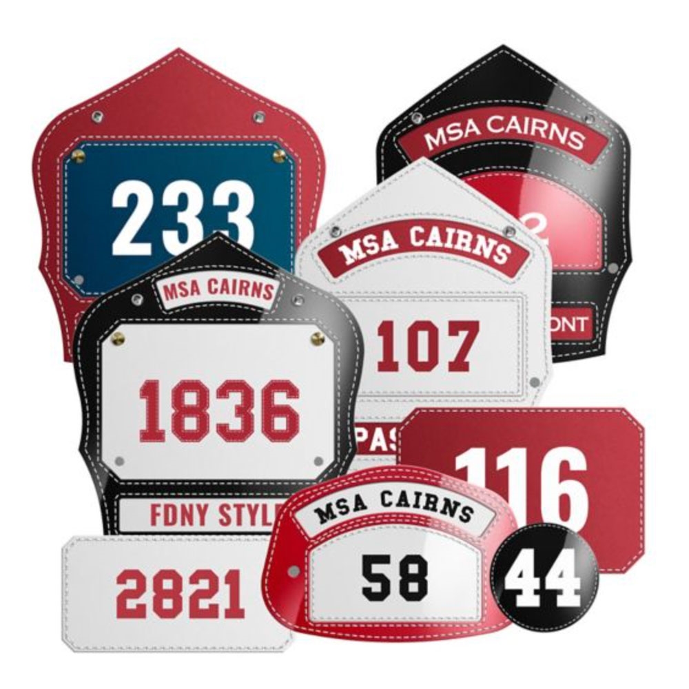 MSA offre une grande variété d'écussons en cuir personnalisés, des boucliers et des écussons de responsabilité pour votre casque de pompier Cairns, dans les configurations Standard et Passport™.
